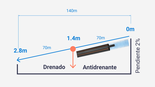 Sin embargo, es importante tener en cuenta que si el diferencial de altura a lo largo de la manguera supera los 1.4 metros, la manguera podría drenarse parcialmente al final del ciclo de riego. Para abordar este problema, se puede instalar una válvula DNL en el punto medio de la manguera. Por ejemplo, si tenemos un terreno con surcos de 140 metros de largo y con un desnivel del 2%, esto resultaría en un desnivel total de 2.8 metros. Dado que este excede la capacidad del sistema CNL, colocar una válvula DNL en el punto medio de la manguera ayudaría a mantener el sistema funcionando de manera eficiente.