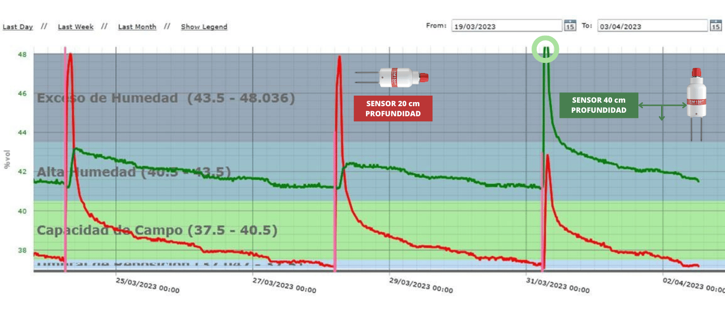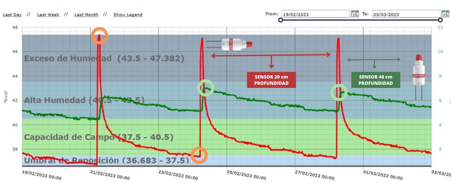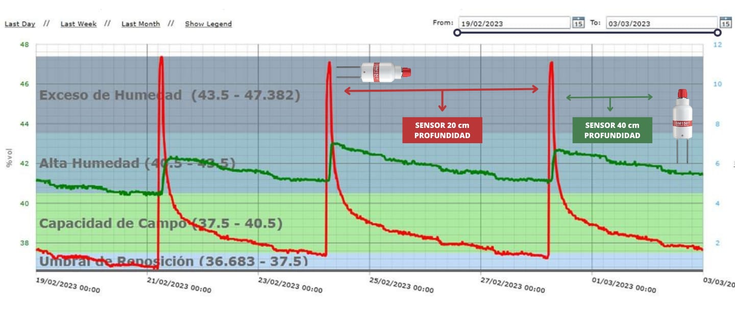 Este tipo de sensores de humedad son compatibles con cultivos protegidos y cultivos a cielo abierto, frutales en su mayoría, un ejemplo de estos serían los cultivos con raíces parcialmente superficiales tales como el aguacate, banano, agave etc., que por contar con estas características se recomienda la instalación de dos sensores Delta T-SM 150; uno colocado a 20 cm de profundidad y el segundo a 40 cm de profundidad y obtener dos lecturas como la imagen de la gráfica anterior lo muestra con el siguiente objetivo: